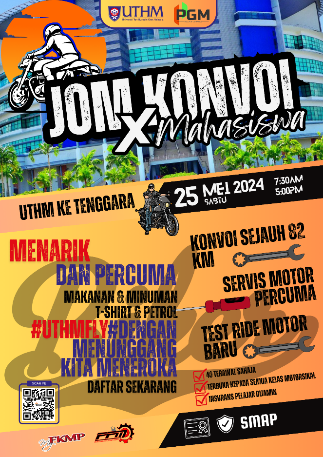 Program Dengan Menunggang Kita Meneroka: Konvoi Mahasiswa ke Bandar Tenggara telah dijalankan pada 25/5/2024 hari Sabtu. Program ini merupakan kerjasama diantara FKMP dan PPM dengan syarikat Prima Garage Motorsports, Parit Raja Bikers Club, Batu Pahat Bikers Club, Kluang Bikers Club dan Ahli Parlimen Tenggara. Program ini juga ditaja oleh Prima Garage Motorsports yang digunakan untuk menyediakan baju kepada peserta, token minyak dan barangan keperluan untuk konvoi yang berjumlah sebanyak RM4500. Program ini telah disertai oleh penunggang motorsikal yang terdiri daripada kalangan mahasiswa UTHM, pensyarah kanan, staf UTHM, orang awam dan rakan industri. Konvoi juga turut diikuti bersama dua kereta AJK, dan dua pacuan empat roda. Konvoi ini melibatkan penyertaan seramai 80 orang peserta. Konvoi ini dimulakan di Dataran Anggerik UTHM dan melalui perjalanan sejauh 82km ke Stadium Bandar Tenggara. Konvoi ini juga turut diketuai oleh Yang Berbahagia Prof Sr. Ts. Dr. Lokman Hakim bin Ismail, Timbalan Naib Canselor HEPA. Pelbagai aktiviti dijalankan di Stadium tersebut seperti, pameran motorsikal berkuasa tinggi dari industri KTM, Mitsubishi dan GASGAS, program Jom Servis X Mahasiswa UTHM, aktiviti uji cuba motorcross GASGAS di litar sebenar, pertandingan Tenggara Menjerit (pertandingan bunyi ekzos kreatif), pertandingan Motor cantik dan kreatif, cabutan bertuah, dan jualan rakyat. Program ini juga telah dirasmikan oleh yang berbahagia Dr hj muhd naqib bin hj ghazali, ketua pemuda umno bahagian Tenggara merangkap sebagai COO UKM dan juga wakil ahli parlimen Tenggara. Perjalanan konvoi yang bermula pada jam 7 pagi ini diakhiri pada jam 7.00 petang.